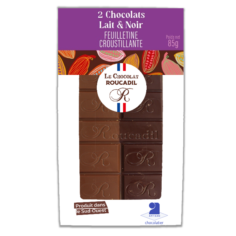 Une tablette de chocolat mixé de chocolat noir et chocolat au lait Feuilletine croustillante.