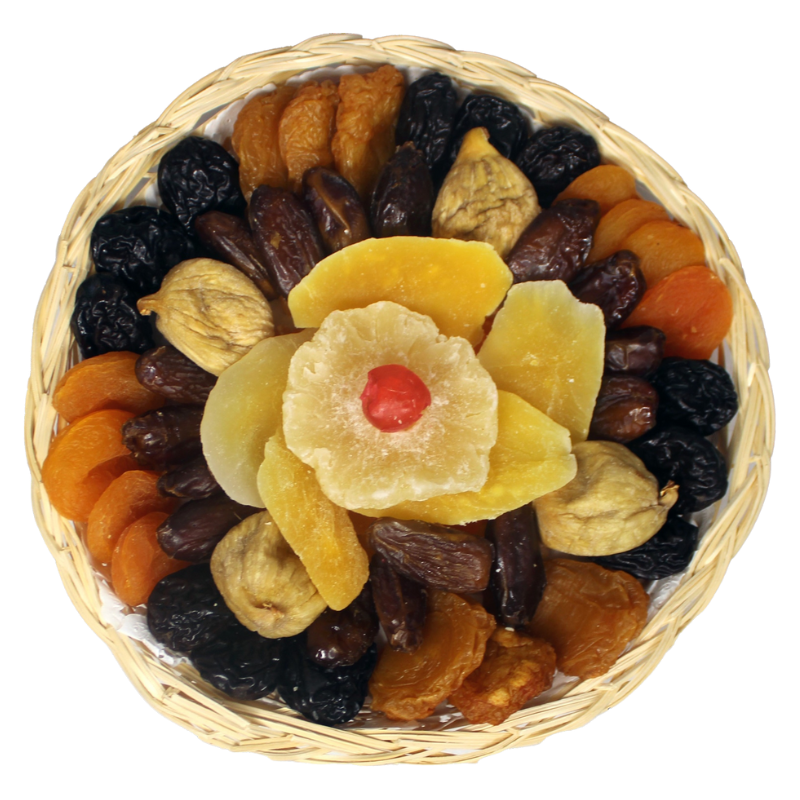 Pruneaux d'Agen, Abricots moelleux, Dattes, Figues moelleuses, Tranches de mangue, Cerise, Tranches d'ananas Séchées, Papayes, Poires moelleuses.